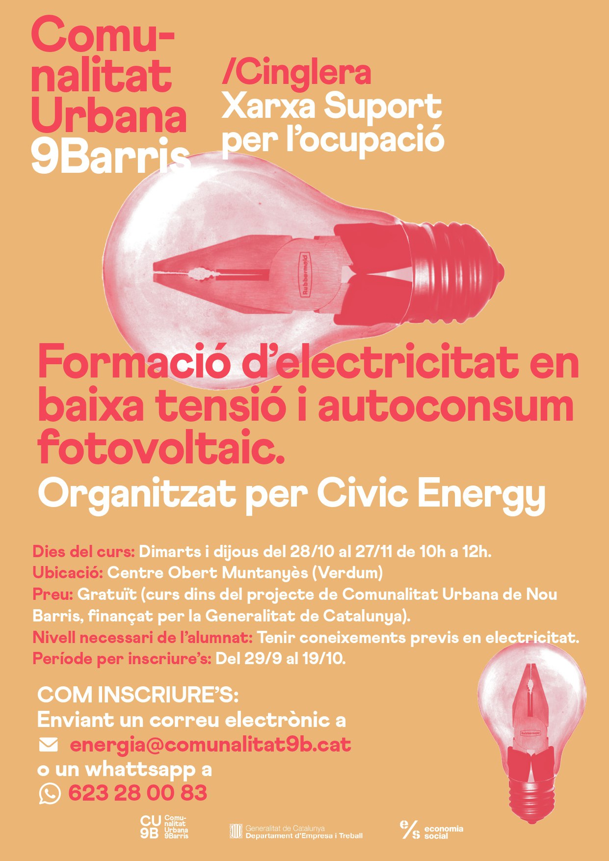 Des de Civic Energy, en el marc de la Comunalitat Urbana de Nou Barris i la Cinglera, posem en marxa un curs gratuït d’electricitat en baixa tensió i autoconsum fotovoltaic, pensat per a totes aquelles persones que ja tenen coneixements o experiència en el sector elèctric i volen actualitzar-se o reciclar-se.